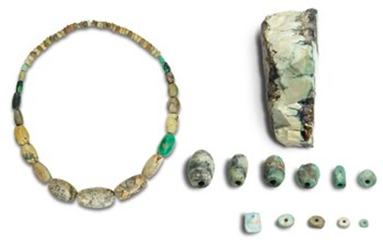 Collar y cuentas de variscita (Can Tintorer, Gavà). Las minas de Gavà son las más antiguas del mundo hechas en galería, después convertidas en necrópolis; albergan enterramientos múltiples sin ajuar en individuos con deformaciones patológicas del trabajo minero; pero también se encuentran enterramientos individuales con ajuares rituales, obsidiana de Sicilia, variscita catalana, sílex francés, etc.